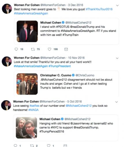 Cohen reportedly enlisted tech tycoon John Gauger for campaign services that included “trying unsuccessfully to manipulate two online polls in Mr. Trump’s favor” — and, more importantly, to create @WomenForCohen. The account’s bio describes it being created by “Women who love and support Michael Cohen. Strong, pit bull, sex symbol, no nonsense, business oriented, and ready to make a difference!” Swoon!